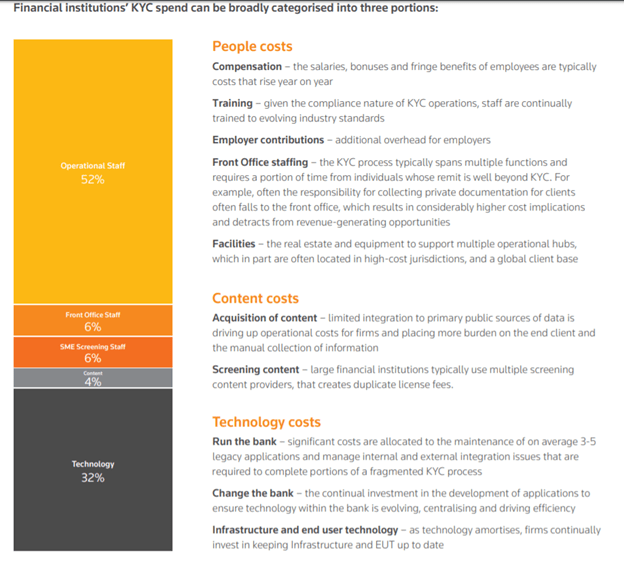 A separate study by Refinitiv further breaks down the cost of KYC, much of the cost is largely attributed to staffing costs, which supports the idea that digitising the KYC process could significantly reduce the cost of customer onboarding.